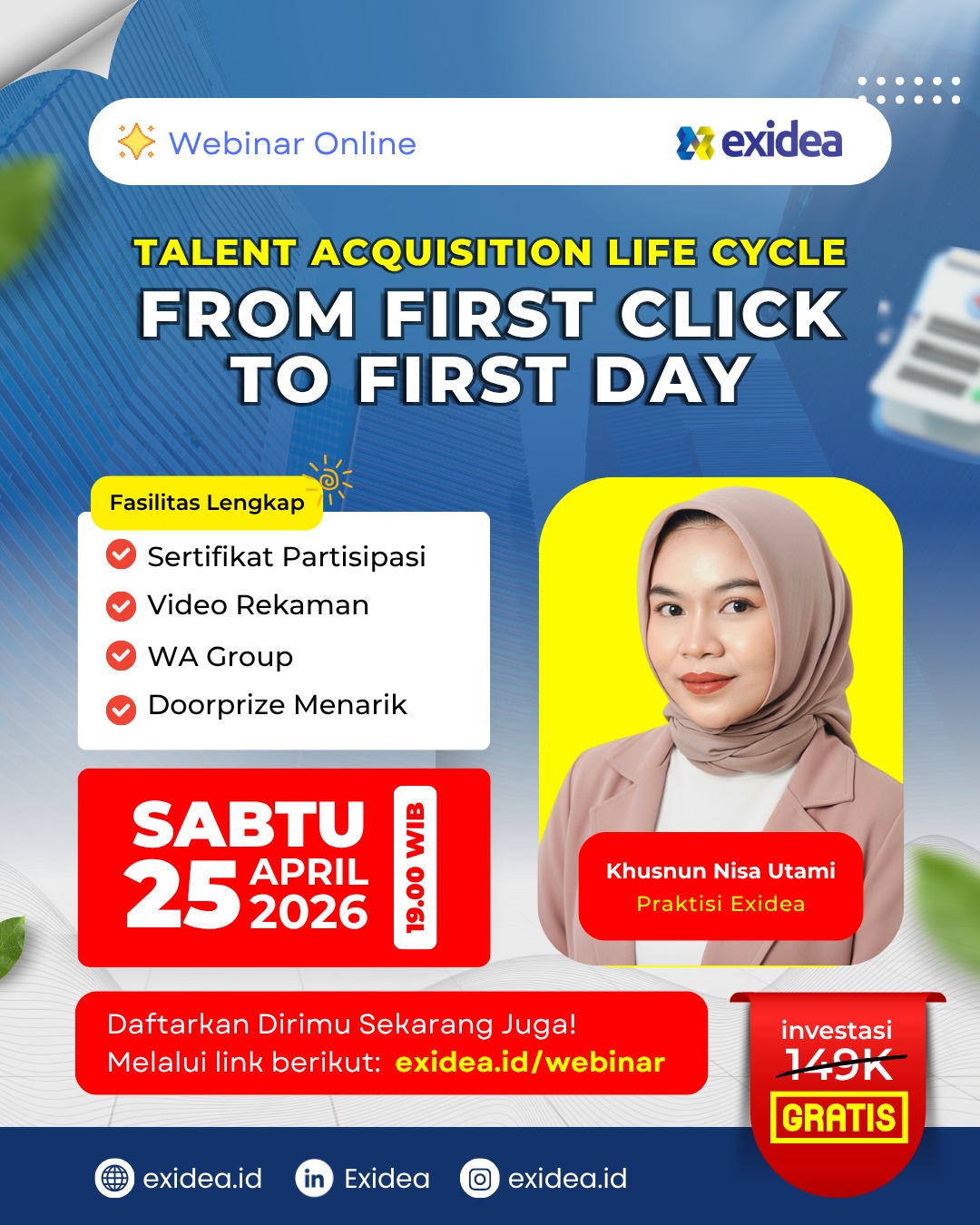 Melalui webinar bertema “Talent Acquisition Life Cycle: From First Click to First Day”, peserta akan diajak memahami tahapan lengkap dalam proses Talent Acquisition, mulai dari strategi menarik kandidat hingga proses onboarding, sehingga memiliki gambaran yang komprehensif mengenai peran dan praktik di bidang ini.